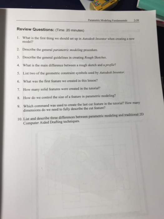 List two of the geometric constraint symbols used by Autodesk Inventor 6. 3 Describe the general guidelines in creating Rough Sketches. 2-36 SOLIDWORKS 2018 and E Questions.